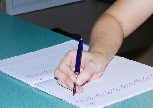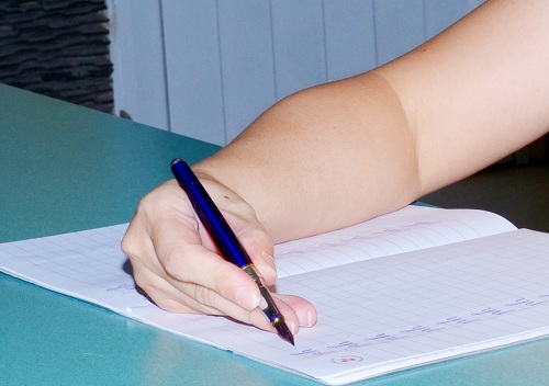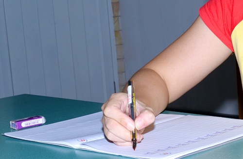 - Vô cùng quan trọng để luyện viết chữ đẹp, viết nhanh. Tay phải cầm bút bằng 2 ngón tay: cái, trỏ. Bút tựa vào ngón giữa sao cho thân bút hơi nghiêng về bên phải cổ tay. Mu bàn tay úp xuống vở, tay cầm bút luôn thấp hơn dòng chữ muốn viết. Ngón trỏ không quá đè mạnh vào bút. Ngón cái và ngón trỏ giữ bút tạo thành vòng tròn hở ra một khe. Cầm bút cách ngòi bút khoảng 3cm.