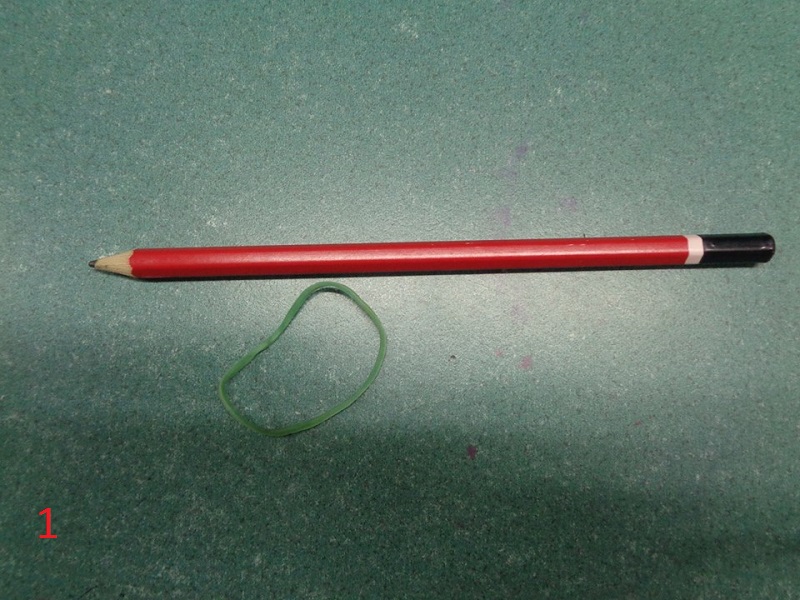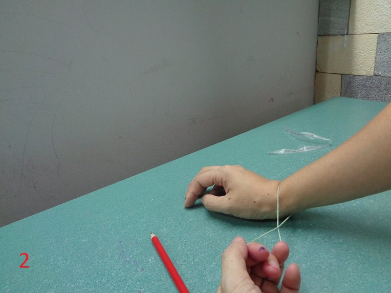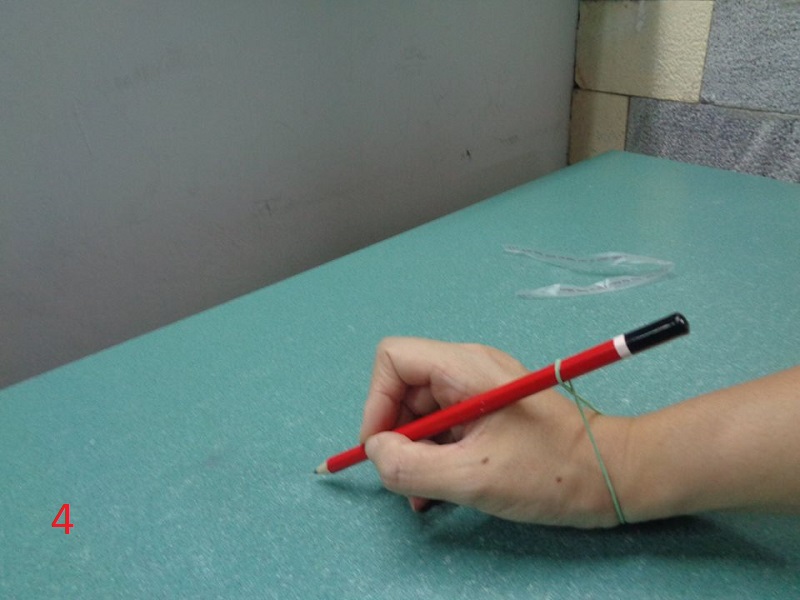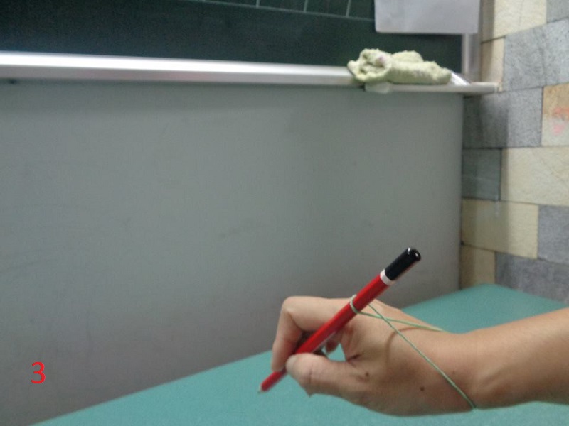 * Cần có một một cái chun vòng, bạn chọn cái chun đã qua sử dụng, độ đàn hồi của chun đã kém đi. Lồng chun vào cổ tay phải. Vòng chun theo hình số 8 rồi lồng chun vào thân bút ( ảnh chụp minh họa).