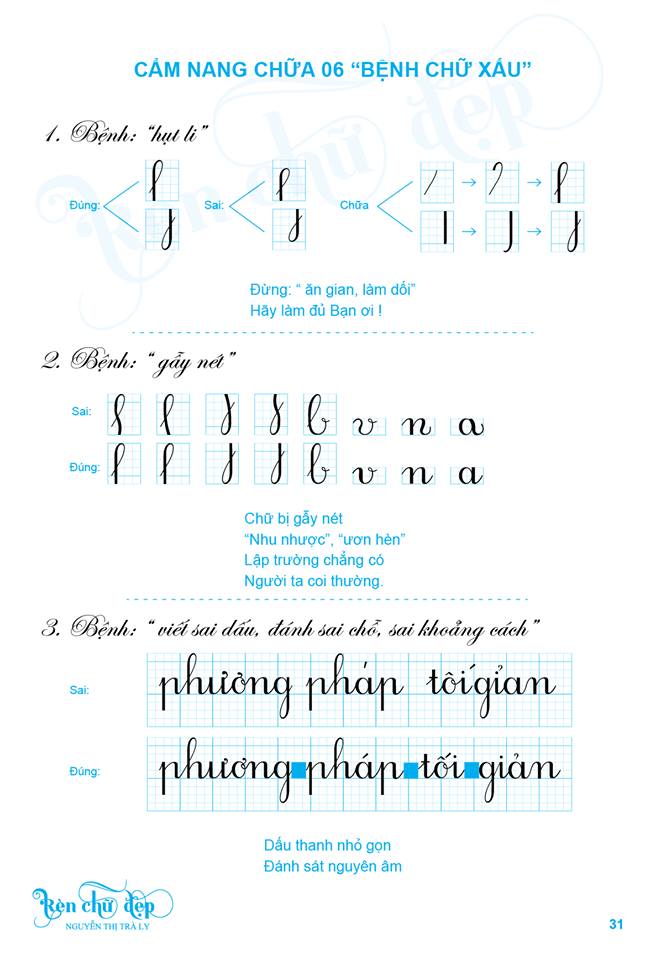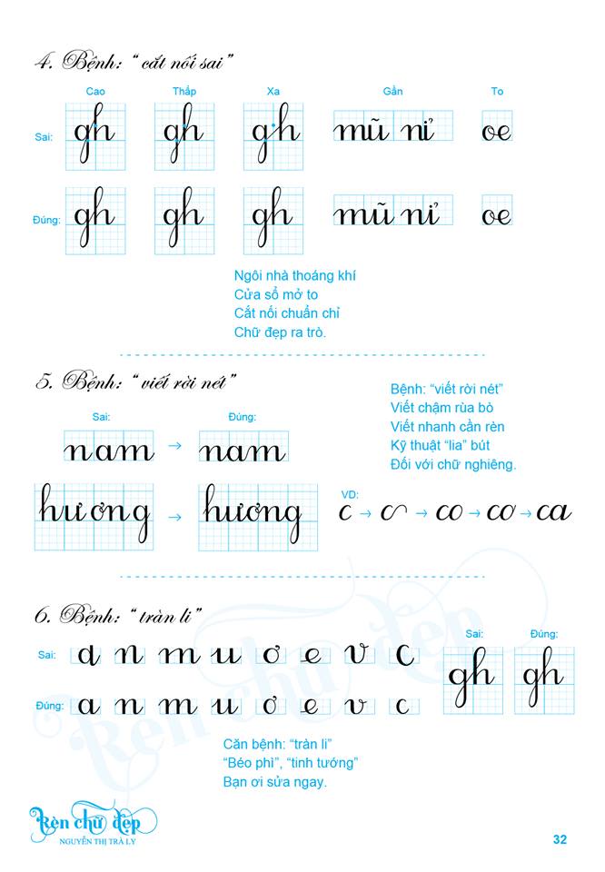 4/ Điểm cắt nối chữ sai. Trẻ thường cắt nối chữ ở 11 phụ âm kép thấp. Chữ sẽ không có khe hở hoặc khe hở ít, nhìn rất " bí" mắt.